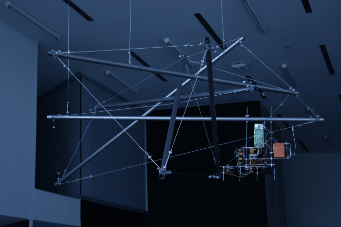 «Una nube de antenas, un abigarramiento de paramentos suspendidos por un sistema de tensegridad. Cada paramento recibe una señal sonora de este exterior inmediato y mediado por un mezclador, retransmite señales en distintas frecuencias desde el UHF al VHF; las frecuencias de un radiotaxi, de barcos o de radioaficionados, quizás de las radios FM, pueden ser captadas por las antenas de la obra, pero sobre todo las distintas calidades de ruidos: ruidos blancos, rosas, violetas, marrones y grises. Estos ruidos son esculpidos por la mezcladora de señales y volumen, también por la interferencia de los cuerpos en tránsito con su natural estática, y por los aparatos de radiofrecuencia con los que porten. Las ondas que llenan todo el contexto al que se abalcona PROA, son radiaciones invisibles que componen una capa de este territorio, y dan cuenta de la naturaleza de enjambre de acumulación industrial, mecánica, eléctrica y de ondas, que se manifiestan para nosotros.» Cita de Cristian Espinoza