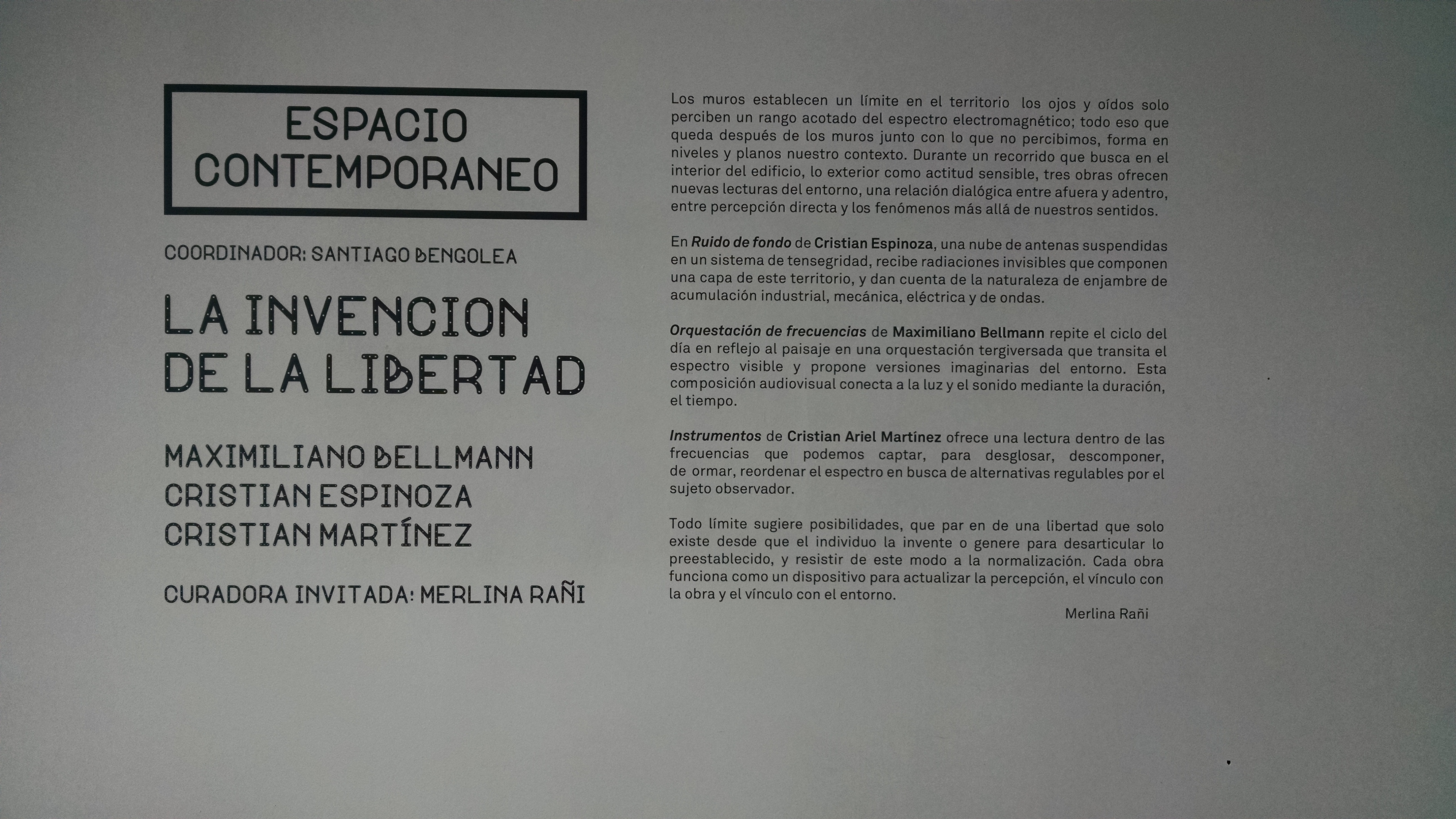 Bajo los lineamientos de la convocatoria (generar una propuesta site specific que se desarrolle en cualquier parte del edificio exceptuando las salas de exhibición) presentamos junto a Cristian Espinoza, Maximiliano Bellmann y Cristian Martínez, La invención de la Libertad.