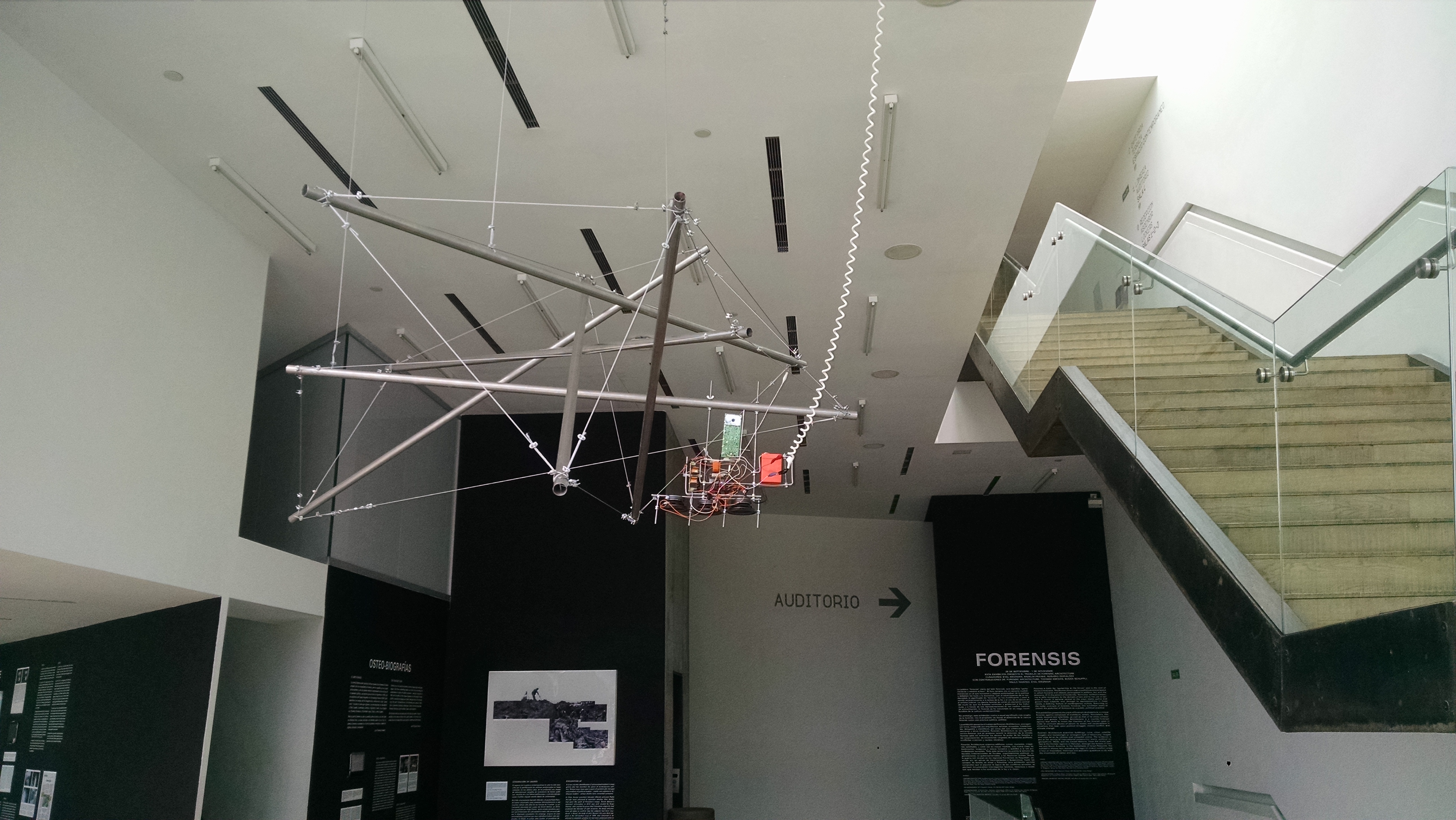 La propuesta consistió en disponer estas tres obras en el recorrido detectado, comenzando por Ruido de fondo de Cristian Espinoza, dispuesta en el foyer, espacio de circulación entre el auditorio, la librería y las escaleras.